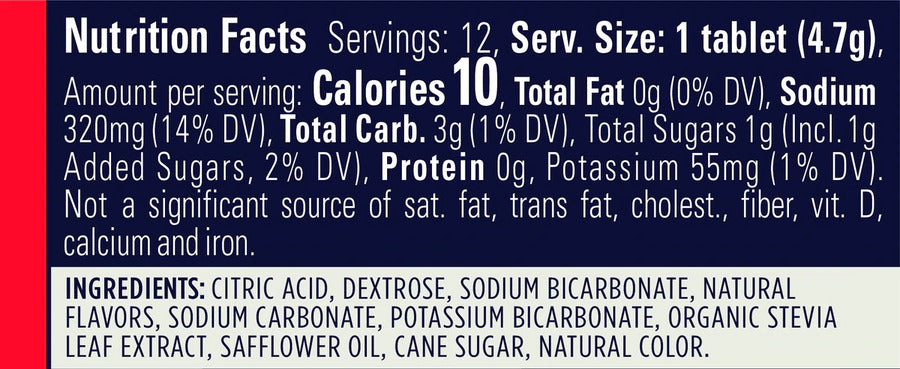 12 Servings per Tube 1 Tablet per Serving 10 cal, 320mg of sodium, and 55mg of potassium per Serving